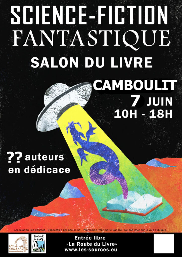 Dimanche 7 juin – Salon du Livre « Fantastique et Science-Fiction » Salle des Fêtes de Camboulit de 10h à 18h – Pour toute information, contacter Jean-Luc par mail salondulivre@les-sources.eu ou au +33 6 07 87 31 82